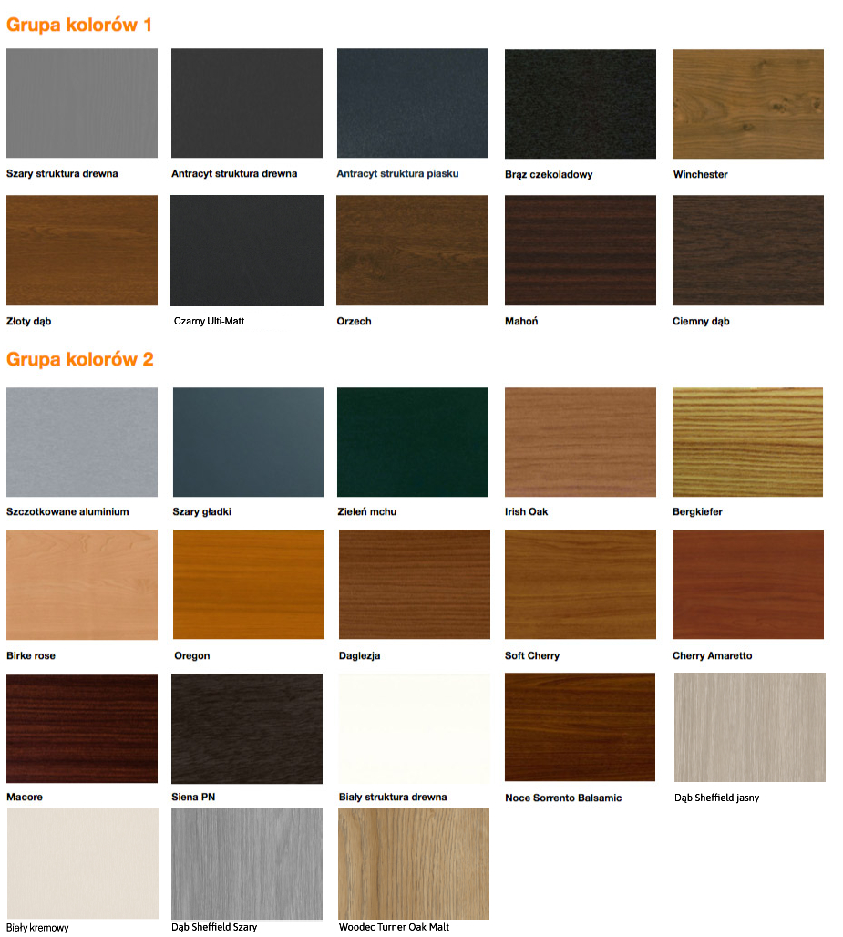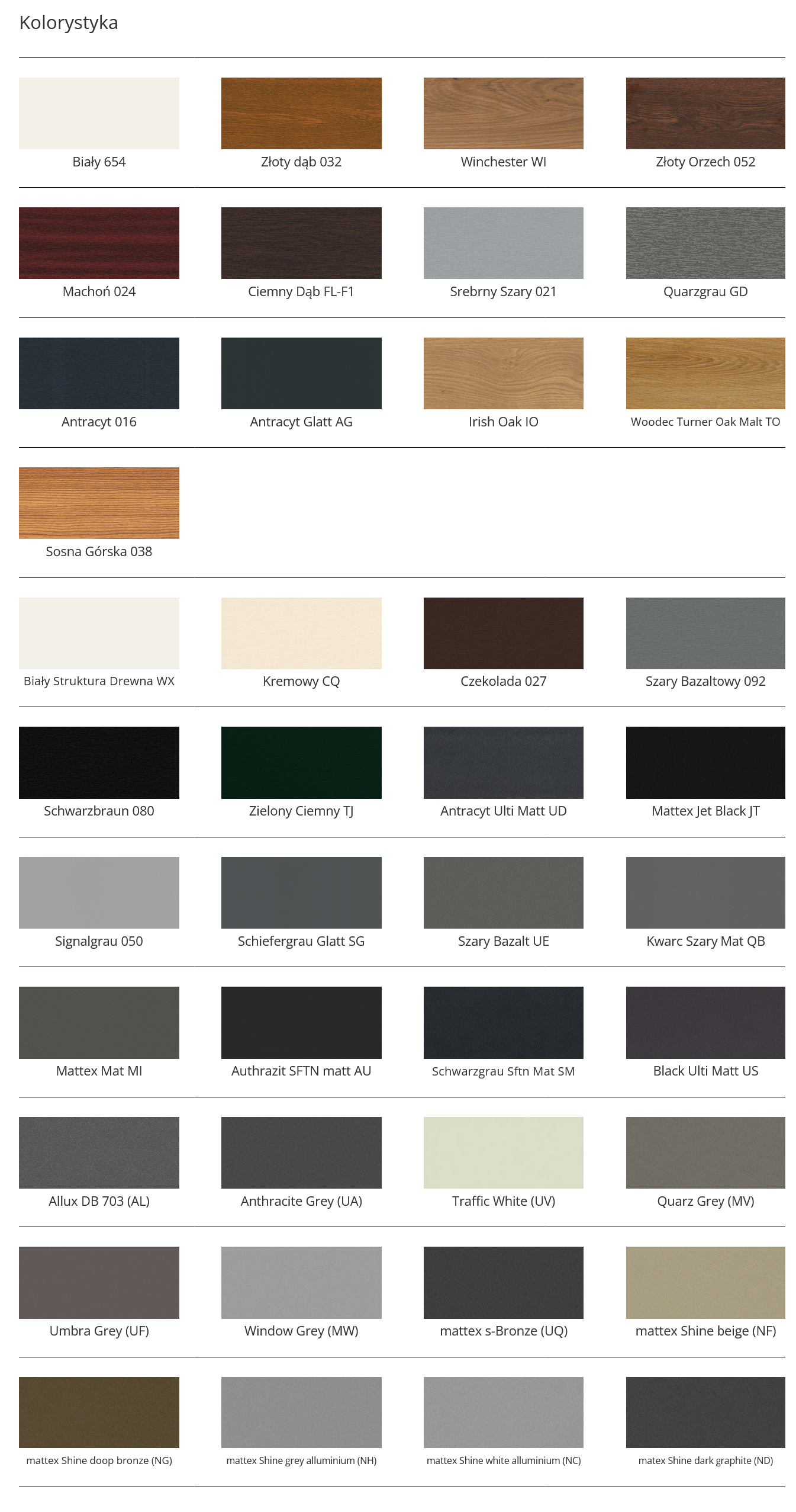 - Bogata gama kolorystyczna uzyskana dzięki barwieniu profili i zastosowaniu oklein o gładkiej lub drewnopodobnej strukturze